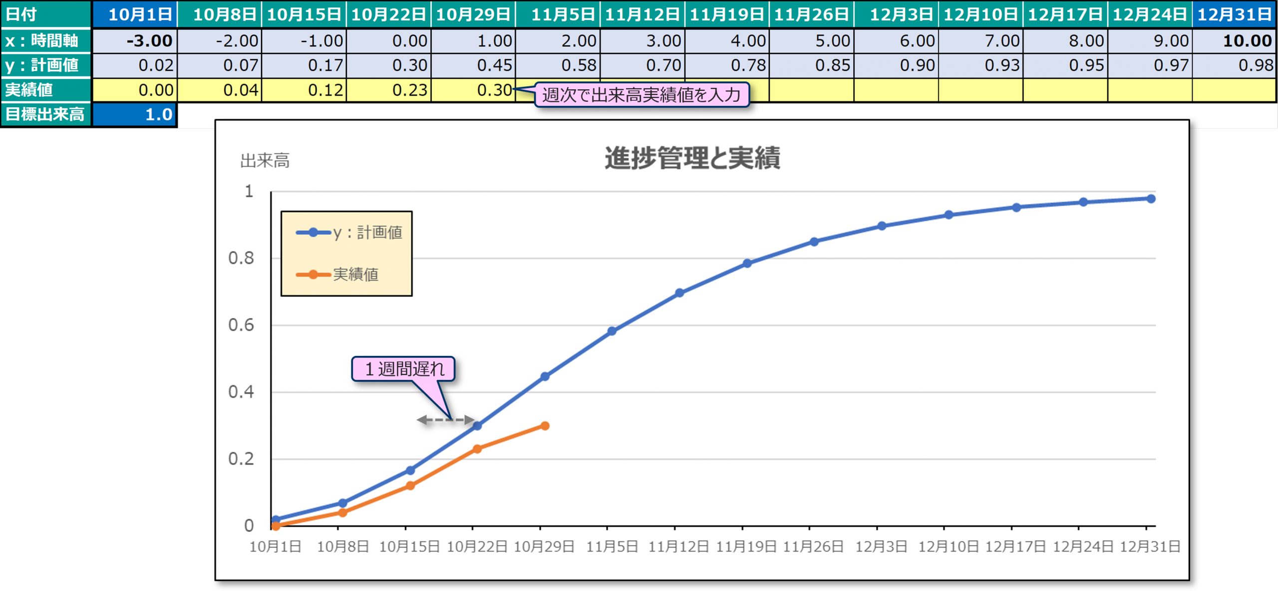- y :ゴンぺルツ関数を使用して、x 時点の計画値 y が自動計算され、進捗計画表に表示される。