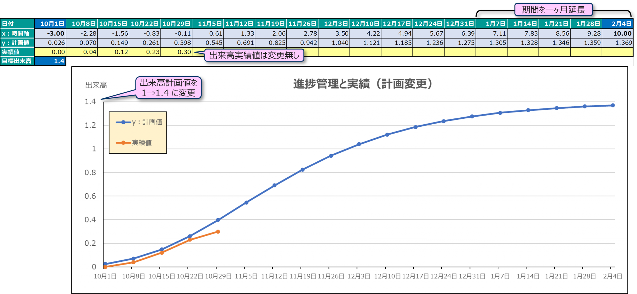 出来高計画値の変更( 1→ 1.4 )、進捗遅れ発生(一週間)により、進捗計画を変更した事例を紹介します。