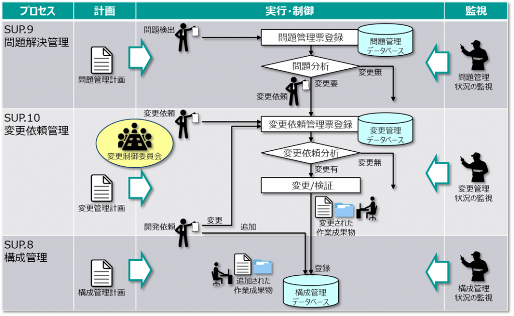 変更依頼管理に基づき、実際に作業成果物に変更を加えていく場合は、SUP.8:構成管理プロセスの仕組みを利用することになるのです。